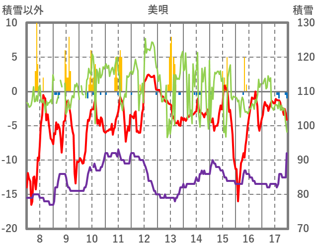| 日 | 時 | 気温 | 降水 | 風向/風速 | 日照 | 積雪 | 降雪 |