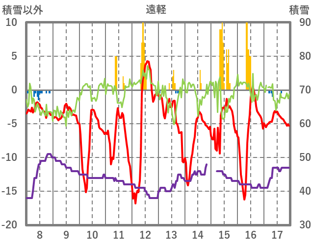 | 日 | 時 | 気温 | 降水 | 風向/風速 | 日照 | 積雪 | 降雪 |