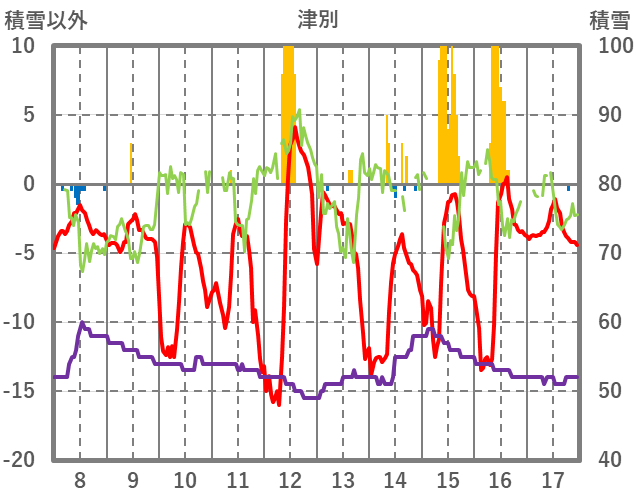 | 日 | 時 | 気温 | 降水 | 風向/風速 | 日照 | 積雪 | 降雪 |