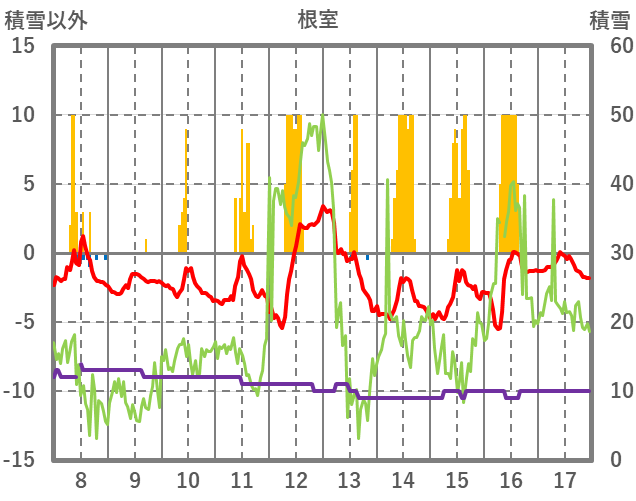 | 日 | 時 | 気温 | 降水 | 風向/風速 | 日照 | 積雪 | 降雪 |