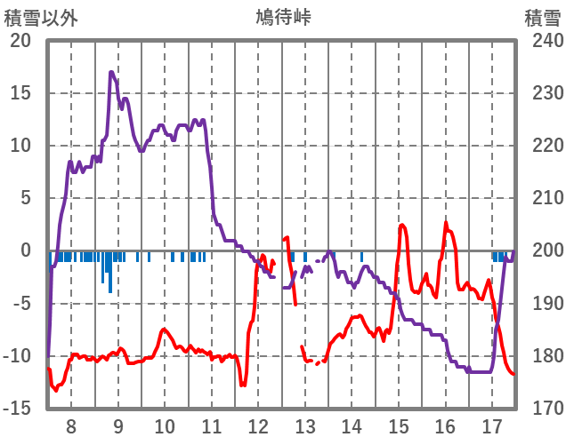 | 日 | 時 | 気温 | 降水 | 風向/風速 | 日照 | 積雪 | 降雪 |
