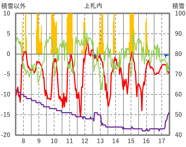 | 日 | 時 | 気温 | 降水 | 風向/風速 | 日照 | 積雪 | 降雪 |