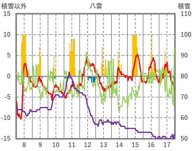 | 日 | 時 | 気温 | 降水 | 風向/風速 | 日照 | 積雪 | 降雪 |