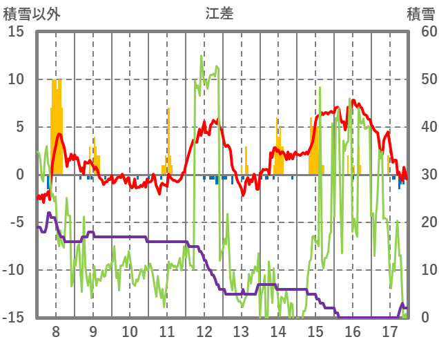 | 日 | 時 | 気温 | 降水 | 風向/風速 | 日照 | 積雪 | 降雪 |
