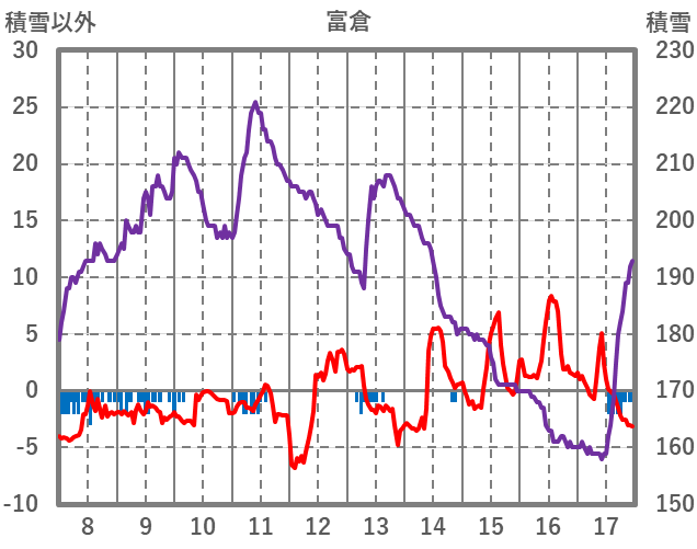 | 日 | 時 | 気温 | 降水 | 風向/風速 | 日照 | 積雪 | 降雪 |
