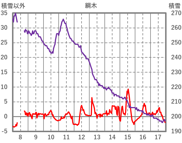 | 日 | 時 | 気温 | 降水 | 風向/風速 | 日照 | 積雪 | 降雪 |