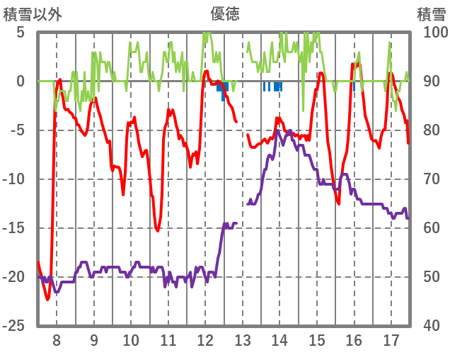 | 日 | 時 | 気温 | 降水 | 風向/風速 | 日照 | 積雪 | 降雪 |