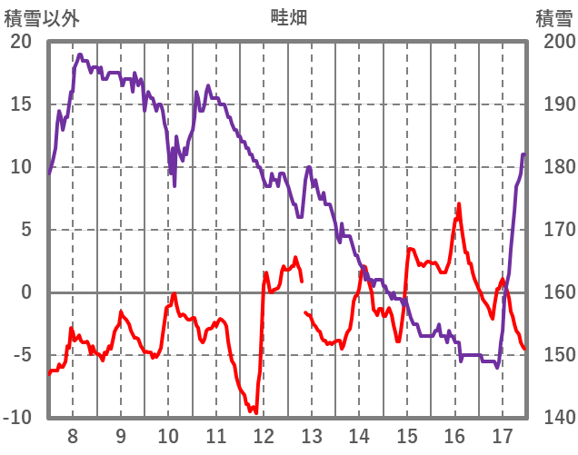 | 日 | 時 | 気温 | 降水 | 風向/風速 | 日照 | 積雪 | 降雪 |