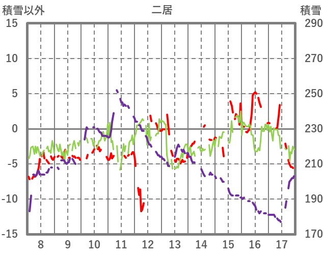 | 日 | 時 | 気温 | 降水 | 風向/風速 | 日照 | 積雪 | 降雪 |