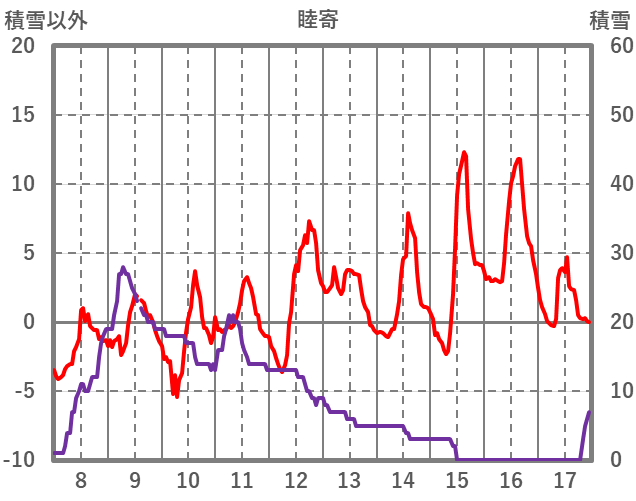 | 日 | 時 | 気温 | 降水 | 風向/風速 | 日照 | 積雪 | 降雪 |