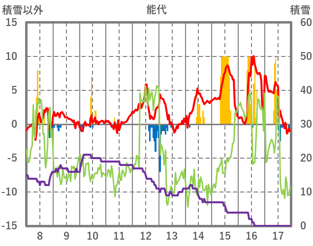 | 日 | 時 | 気温 | 降水 | 風向/風速 | 日照 | 積雪 | 降雪 |