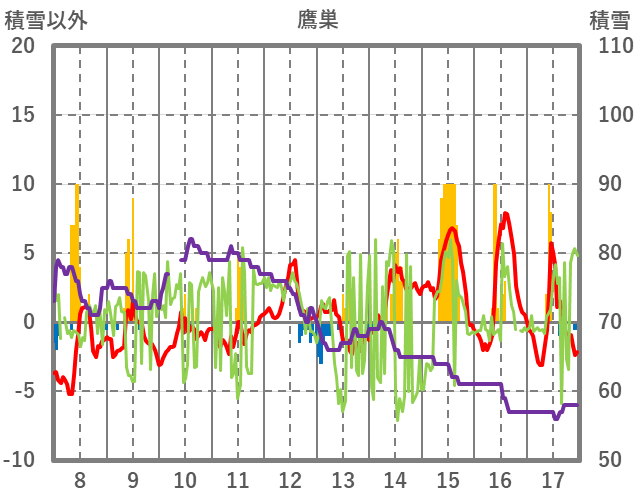| 日 | 時 | 気温 | 降水 | 風向/風速 | 日照 | 積雪 | 降雪 |