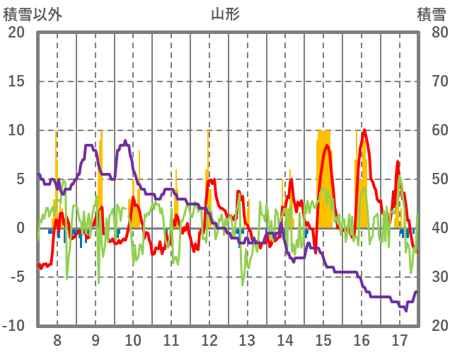 | 日 | 時 | 気温 | 降水 | 風向/風速 | 日照 | 積雪 | 降雪 |