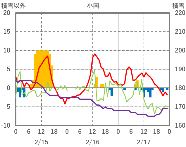 | 日 | 時 | 気温 | 降水 | 風向/風速 | 日照 | 積雪 | 降雪 |