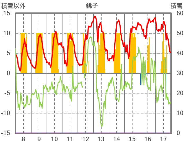 | 日 | 時 | 気温 | 降水 | 風向/風速 | 日照 | 積雪 | 降雪 |