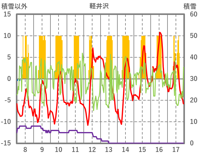 | 日 | 時 | 気温 | 降水 | 風向/風速 | 日照 | 積雪 | 降雪 |