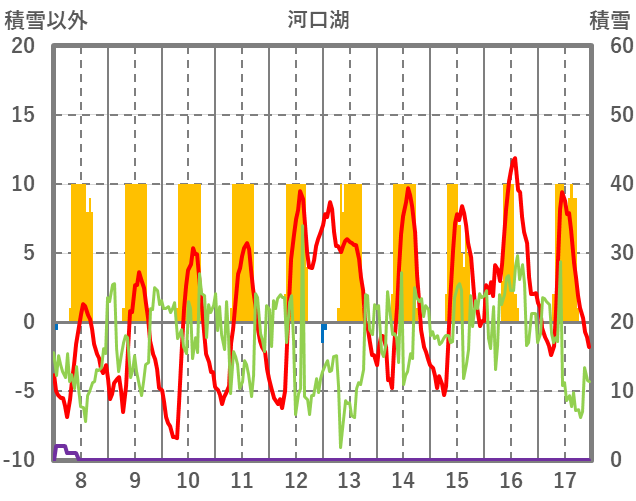 | 日 | 時 | 気温 | 降水 | 風向/風速 | 日照 | 積雪 | 降雪 |
