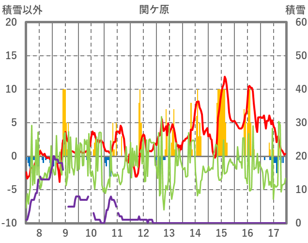 | 日 | 時 | 気温 | 降水 | 風向/風速 | 日照 | 積雪 | 降雪 |