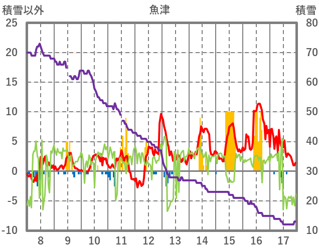 | 日 | 時 | 気温 | 降水 | 風向/風速 | 日照 | 積雪 | 降雪 |