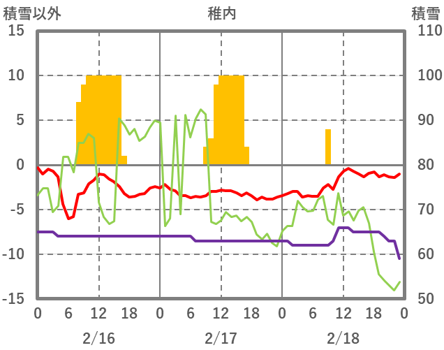 | 日 | 時 | 気温 | 降水 | 風向/風速 | 日照 | 積雪 | 降雪 |