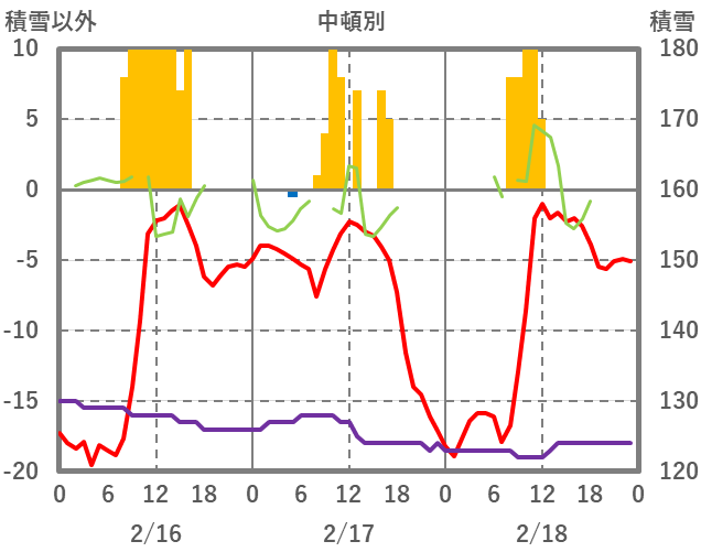 | 日 | 時 | 気温 | 降水 | 風向/風速 | 日照 | 積雪 | 降雪 |