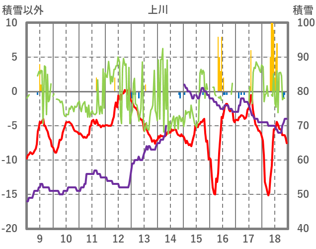 | 日 | 時 | 気温 | 降水 | 風向/風速 | 日照 | 積雪 | 降雪 |