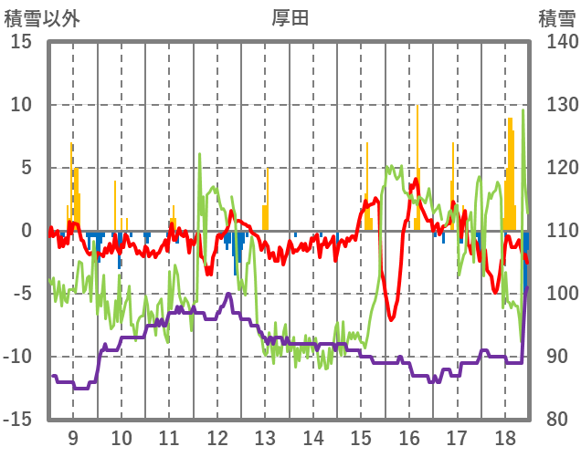 | 日 | 時 | 気温 | 降水 | 風向/風速 | 日照 | 積雪 | 降雪 |