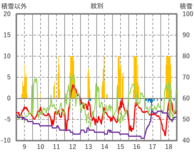| 日 | 時 | 気温 | 降水 | 風向/風速 | 日照 | 積雪 | 降雪 |