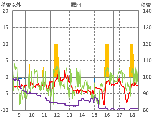 | 日 | 時 | 気温 | 降水 | 風向/風速 | 日照 | 積雪 | 降雪 |