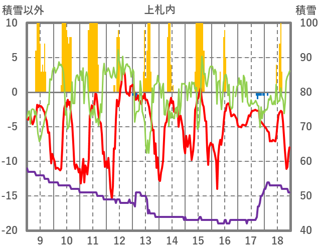 | 日 | 時 | 気温 | 降水 | 風向/風速 | 日照 | 積雪 | 降雪 |