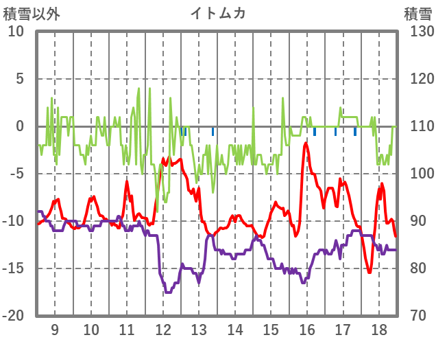 | 日 | 時 | 気温 | 降水 | 風向/風速 | 日照 | 積雪 | 降雪 |