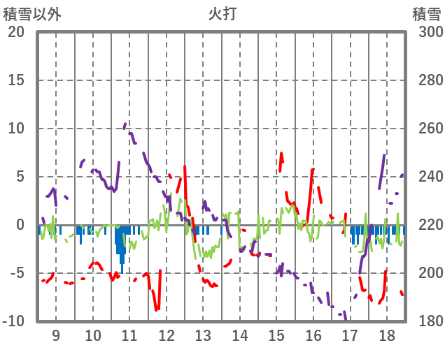 | 日 | 時 | 気温 | 降水 | 風向/風速 | 日照 | 積雪 | 降雪 |