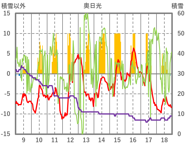 | 日 | 時 | 気温 | 降水 | 風向/風速 | 日照 | 積雪 | 降雪 |