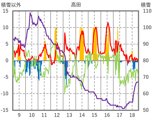 | 日 | 時 | 気温 | 降水 | 風向/風速 | 日照 | 積雪 | 降雪 |