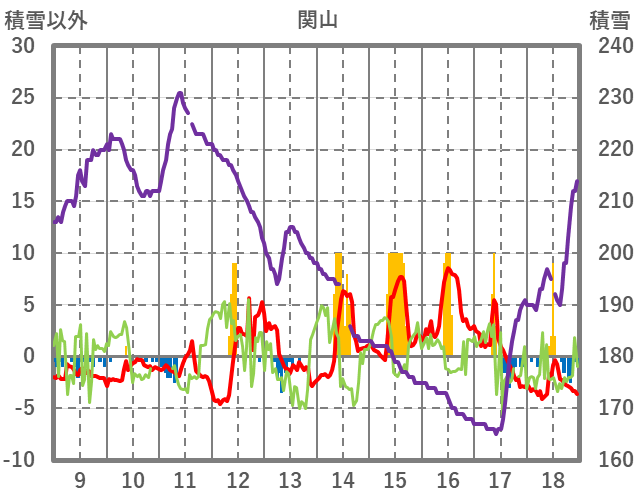 | 日 | 時 | 気温 | 降水 | 風向/風速 | 日照 | 積雪 | 降雪 |