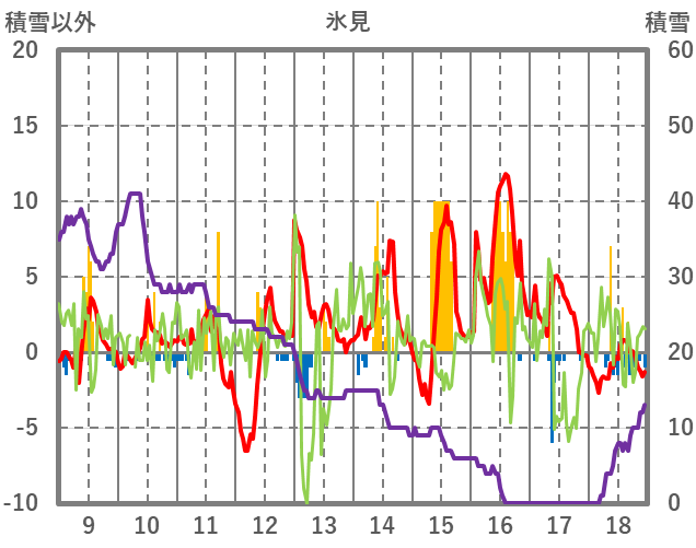 | 日 | 時 | 気温 | 降水 | 風向/風速 | 日照 | 積雪 | 降雪 |