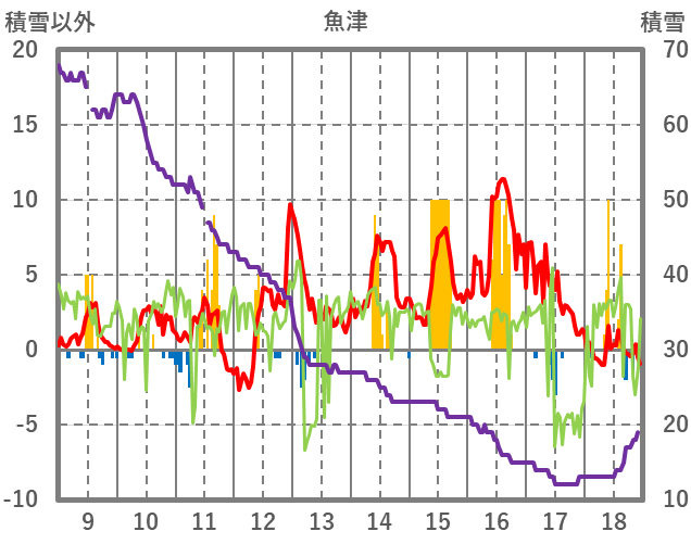 | 日 | 時 | 気温 | 降水 | 風向/風速 | 日照 | 積雪 | 降雪 |