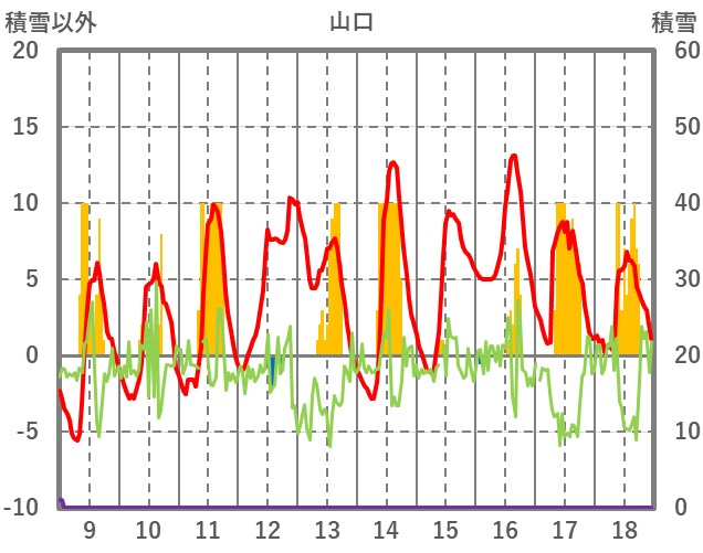| 日 | 時 | 気温 | 降水 | 風向/風速 | 日照 | 積雪 | 降雪 |