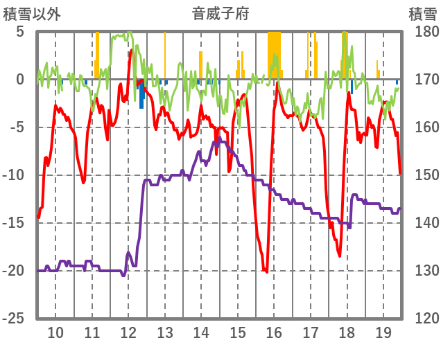 | 日 | 時 | 気温 | 降水 | 風向/風速 | 日照 | 積雪 | 降雪 |