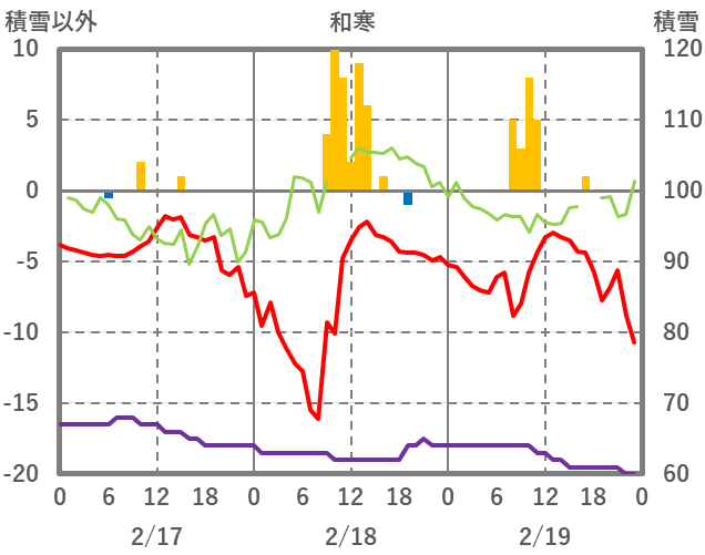 | 日 | 時 | 気温 | 降水 | 風向/風速 | 日照 | 積雪 | 降雪 |