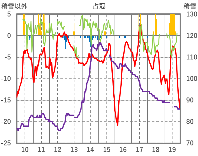| 日 | 時 | 気温 | 降水 | 風向/風速 | 日照 | 積雪 | 降雪 |