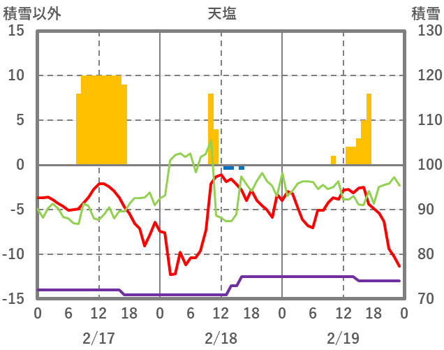 | 日 | 時 | 気温 | 降水 | 風向/風速 | 日照 | 積雪 | 降雪 |