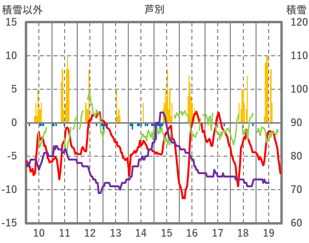 | 日 | 時 | 気温 | 降水 | 風向/風速 | 日照 | 積雪 | 降雪 |