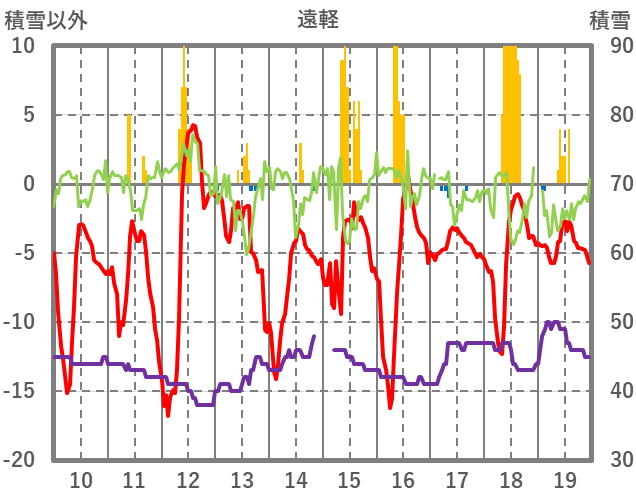 | 日 | 時 | 気温 | 降水 | 風向/風速 | 日照 | 積雪 | 降雪 |