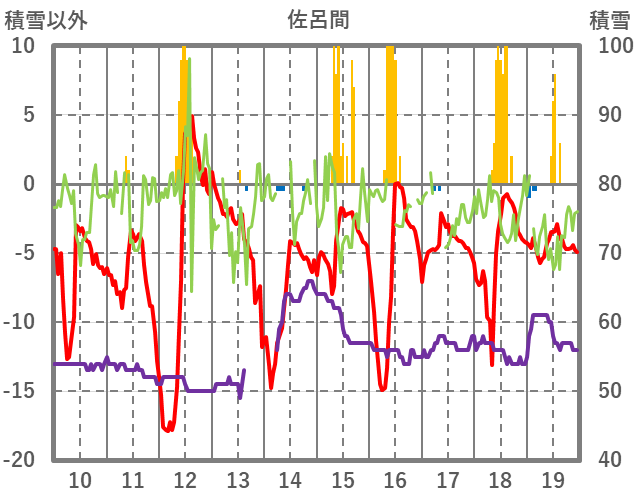 | 日 | 時 | 気温 | 降水 | 風向/風速 | 日照 | 積雪 | 降雪 |