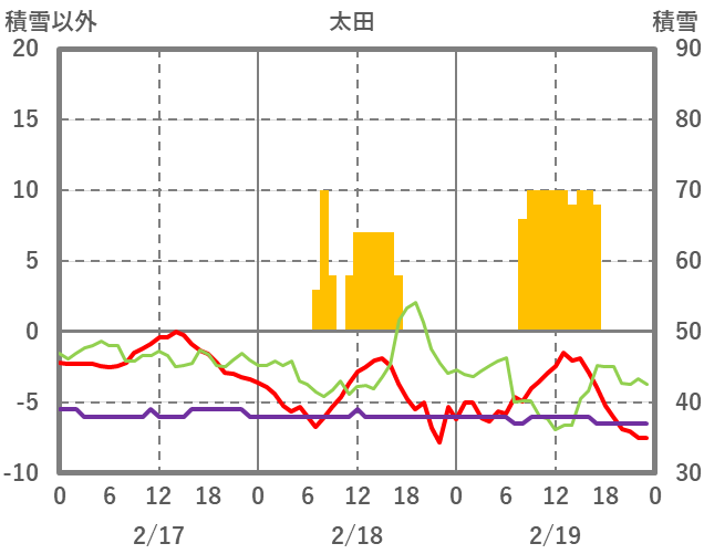 | 日 | 時 | 気温 | 降水 | 風向/風速 | 日照 | 積雪 | 降雪 |
