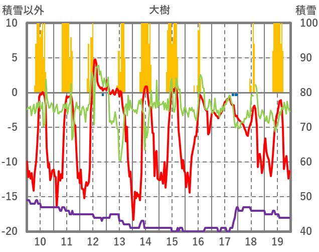 | 日 | 時 | 気温 | 降水 | 風向/風速 | 日照 | 積雪 | 降雪 |