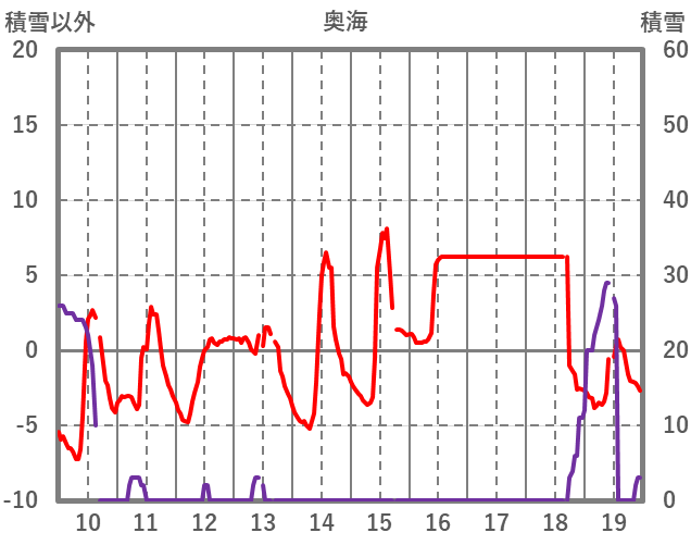 | 日 | 時 | 気温 | 降水 | 風向/風速 | 日照 | 積雪 | 降雪 |