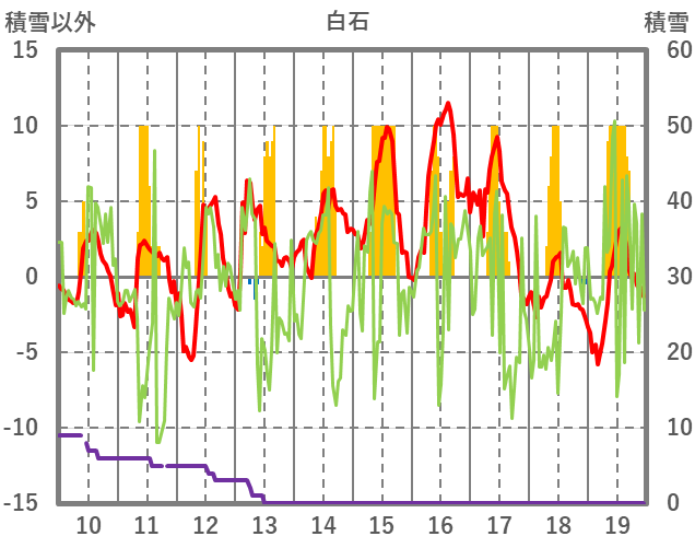 | 日 | 時 | 気温 | 降水 | 風向/風速 | 日照 | 積雪 | 降雪 |