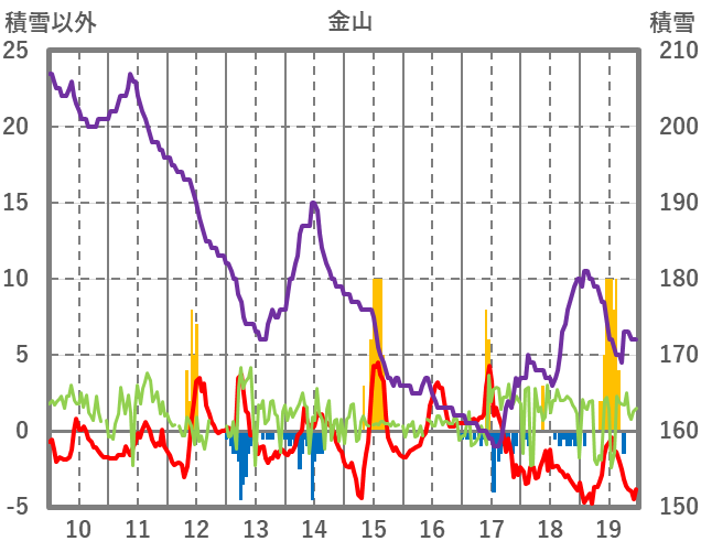 | 日 | 時 | 気温 | 降水 | 風向/風速 | 日照 | 積雪 | 降雪 |